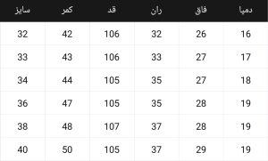 جدول سایزبندی حتما چک کنید و با لباس خود مقایسه کنید